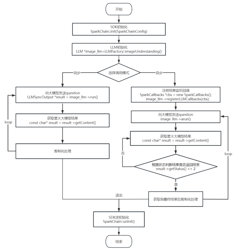 # SparkChain 图像理解 Linux SDK集成文档 ## 1. 图像理解简介 SparkChain支持用户发送一张图片和文本,向大模型提问图片相关的问题,大模型基于发送的图片来给出相应的答案。 ## 2. 兼容性说明 | 类别 | 兼容范围 | | :------- | :----------------------------------------------------------- | | 系统 | 支持x86,x86_64,arm和arm64架构,支持交叉编译,适配常见芯片型号。 | | 开发环境 | 建议使用 VS Studio 进行开发 | ## 3. 授权说明 星火认知大模型授权支持按照tokens授权和设备级授权两种方式。 tokens 授权:授权tokens总量,按照tokens 使用量计费,1 tokens 约等于1.5个中文汉字 或者 0.8个英文单词。 ## 4. SDK集成包目录结构 将SDK zip包解压缩,得到如下文件: ├── Demo SparkChain的使用DEMO,DEMO中已经集成了SDK,您可以参考DEMO,集成SDK。集成前,请先测通DEMO,了解调用原理。 ├── ReleaseNotes.txt SDK版本日志 ├── SDK SparkChain SDK │ └── [libSparkChain.so](http://libsparkchain.so/) └── SparkChain 图片理解 Linux SDK集成文档.pdf SparkChain集成指南 ## 5. SDK工程配置 ### 5.1 导入SDK库 将SDK/libs文件夹、头文件文件夹include存放到项目中,并在环境变量里添加库路径; ```c++ #include "../include/sparkchain.h" ``` ### 5.2 配置权限 如果需要存储日志,SDK日志路径需要读写权限,缺少读写权限,日志将无法正常存储。 ## 6. 接口流程调用图  ## 7. SDK 初始化 **在使用SparkChain 星火大模型交互功能前,需要首先开通星火大模型授权并获取已开通授权的应用信息(appId、apiKey、apiSecret)。SDK全局只需要初始化一次。**初始化时,开发者需要构建一个SparkChainConfig实例config,把相关的appid信息以及日志设置等传入config中,然后再通过SparkChain::init(config)方法把config实例设置到SDK中。SparkChainConfig 结构如下: ```c++ class SPARKCHAIN_API SparkChainConfig { public: static SparkChainConfig* builder(); virtual ~SparkChainConfig(); //配置appid virtual SparkChainConfig* appID(const char* appid) = 0; //配置apiKey virtual SparkChainConfig* apiKey(const char* apiKey) = 0; //配置apiSecret virtual SparkChainConfig* apiSecret(const char* apiSecret) = 0; //配置用户自定义标识 virtual SparkChainConfig* uid(const char* uid) = 0; //配置SDK工作路径 virtual SparkChainConfig* workDir(const char* workDir) = 0; //配置日志等级 virtual SparkChainConfig* logLevel(int logLevel ) = 0; //配置日志存储路径 virtual SparkChainConfig* logPath(const char* logPath) = 0; }; ``` SparkChainConfig接口说明: | 接口名称 | 含义 | 参数类型 | 限制 | 是否必填 | | :-------- | :----------------------------------------------------------- | :---------- | :----------------------------------------------------------- | :------- | | appID | 创建应用后,生成的应用ID | const char* | 与平台生成的appID完全一致 | 是 | | apiKey | 创建应用后,生成的唯一应用标识 | const char* | 与平台生成的apiKey完全一致 | 是 | | apiSecret | 创建应用后,生成的唯一应用秘钥 | const char* | 与平台生成的apiSecret完全一致 | 是 | | logLevel | 日志等级 | int | 枚举,0:VERBOSE,1:DEBUG,2:INFO,3:WARN,4:ERROR,5:FATAL,100:OFF | 否 | | logPath | 日志存储路径,设置则会把日志存在该路径下,不设置则会把日志打印在终端上 | const char* | 设置的路径需要有读写权限 | 否 | | uid | 用户自定义标识 | const char* | | 否 | 初始化返回值:0:初始化成功,非0:初始化失败,请根据具体返回值参考错误码章节查询原因。 具体示例如下: ```c++ SparkChainConfig* config = SparkChainConfig::builder(); config->appID("$appId") ->apiKey("$apiKey") ->apiSecret("$apiSecret");//从平台获取的授权appid,apikey,apisecrety int ret = SparkChain::init(config); ``` ## 8. LLM 初始化 SDK是通过LLM实例和大模型进行交互的,不同的功能需要创建不同类型的LLM实例,SDK通过LLMFactory类向开发者提供相应功能的LLM实例。LLMFactory提供的LLM实例构造方法如下: | 功能 | 说明 | | :------- | :----------------------------------------------------------- | | 图片理解 | 构造方法: <br />static LLM* imageUnderstanding(LLMConfig* config = nullptr, Memory* memory = nullptr); <br />参数说明: <br />config:星火大模型配置参数。其中的domain为image,其他domain参数不生效。 <br />memory:Memory,星火可以根据memory进行上下文关联回答 | - LLMConfig 结构如下: ```c++ class SPARKCHAIN_API LLMConfig { public: static LLMConfig* builder(); virtual ~LLMConfig(); //需要使用的领域 virtual LLMConfig* domain(const char* domain) = 0; //内容审核的场景策略 virtual LLMConfig* auditing(const char* auditing) = 0; //配置关联会话chat_id标识,需要保障用户下唯一 virtual LLMConfig* chatID(const char* chatID) = 0; //配置核采样阈值,改变结果的随机程度 virtual LLMConfig* temperature(float temperature) = 0; //配置从k个候选中随机选择⼀个(⾮等概率) virtual LLMConfig* topK(int topK) = 0; //回答的tokens的最大长度 virtual LLMConfig* maxToken(int maxToken) = 0; //配置chat服务器域名地址 virtual LLMConfig* url(const char* url) = 0; }; ``` - LLMConfig 接口说明: | 接口名称 | 含义 | 参数类型 | 限制 | 是否必传 | | :---------- | :------------------------------------------ | :---------- | :----------------------------------------------------------- | :------- | | domain | 需要使用的领域 | const char* | 取值为[general,generalv2,generalv3,tti,image],默认generalv2 <br />general:通用大模型V1.5版本 <br />generalv2:通用大模型V2版本 <br />generalv3:通用大模型V3版本 <br />generalv3.5:通用大模型V3.5版本 <br />tti: 图片生成访问的是大模型tti服务 <br />image: 图片理解访问的是大模型image服务 <br